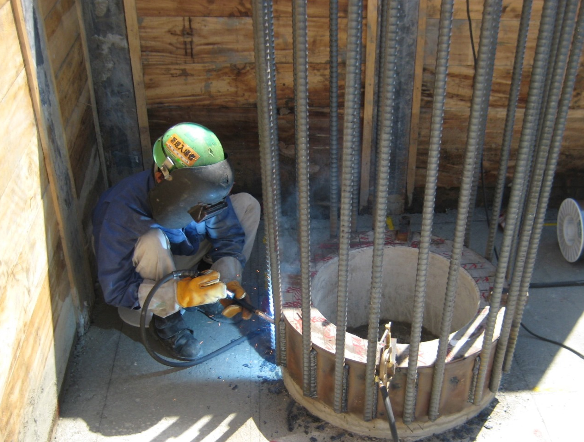 鉄筋同士を継ぐ工法です。極めて狭いスペースで高速で溶接できるなど、